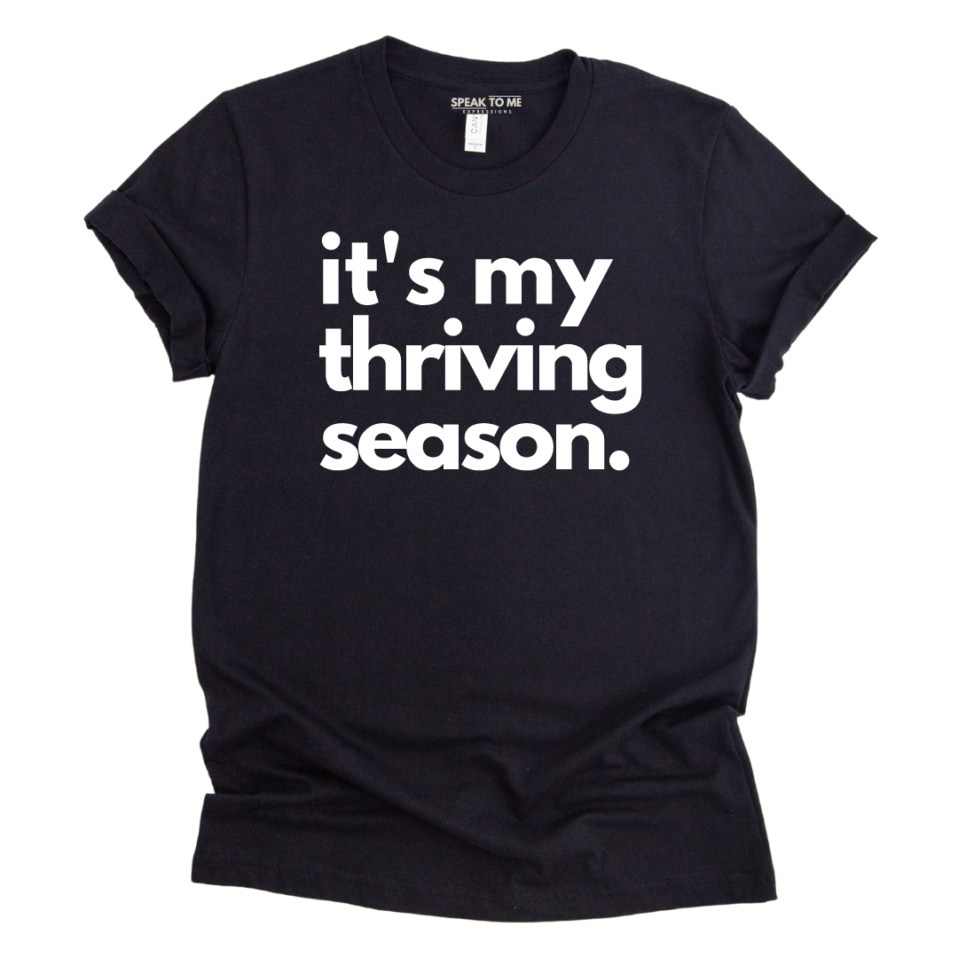 You are in your greatest season yet! This shirt was created to speak for you and the season you are in. Stay rooted in Christ so that you can continue to thrive (grow). Psalm 1:3. Shop this tee if you are thriving and not just surviving.