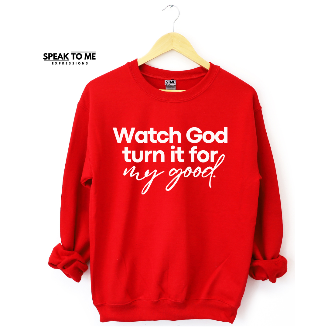 Watch God Turn It Around sweatshirt is inspired by Gen. 50:20. It celebrates the belief that even in challenging times, God can make a way to turn things around for your good. Know that whatever was sent to harm you, God can turn it for your good. Embrace this encouraging message and wear it as an assurance of God's promise to turn hardship into joy.